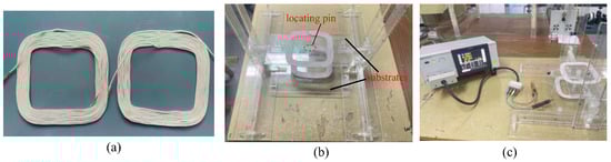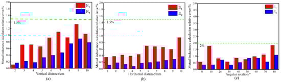 The vertical distance h between the two coils remains constant at 80 mm. Figure 14c illustrates the schematic diagram of the secondary coil rotating around the X’-axis. The angle α increases from 0° to 90°, and the mutual inductance of the coil is presented in Table 10. It is observed that the experimental error remains below 2% during the transition of the angle from 0° to 90°, and the calculations align with the experimental results. When α < 45°, the mutual inductance remains constant as the angle increases. However, when α > 45°, the magnetic linkage through the secondary coil gradually decreases with the increase in α, resulting in a decline in mutual inductance.