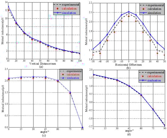 Comparison diagram of mutual inductance calculation, experiment, and simulation: (a) vertical offset; (b) horizontal offset; (c) angular rotation; and (d) angular rotation with offset.