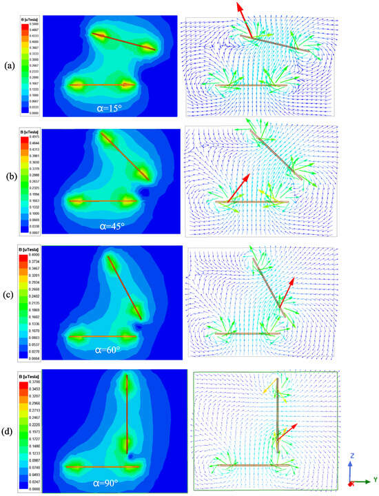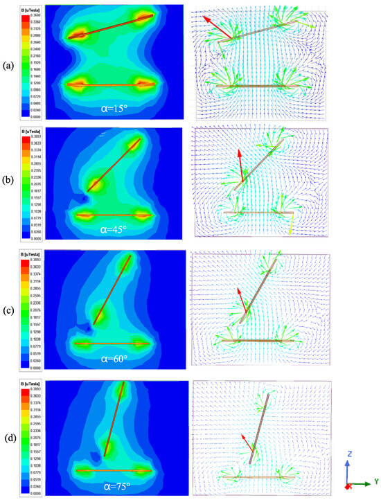 It can be observed from the magnetic induction intensity and the magnetic field distribution cloud diagram during the rotation of the angle (Figure 17) that when α is at 15° and 45°, the magnetic field strength is approximately 0.35 μT. The change in coupling magnetic linkage between the coils is minimal, and the mutual inductance between the coils remains essentially unchanged. However, when the angle increases to 60°, the magnetic induction intensity decreases to 0.18 μT. The arrow in the figure indicates the direction of the magnetic induction line of the coil.