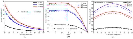 Figure 19a illustrates the mutual inductance curve between the secondary coil and the primary coil as the number of turns varies in the vertical direction. The horizontal axis represents the vertical distance in 10 mm intervals, while the vertical axis indicates mutual inductance, measured in microhenries (μH). The theoretical values of mutual inductance depicted in this figure closely align with the simulation results. The maximum error occurs at a distance of 10 mm, with an approximate error of 6%. As the vertical distance increases, the discrepancy between the theoretical calculations and the simulation results gradually diminishes, with the two nearly coinciding at a distance of 100 mm. Figure 19b presents the mutual inductance curve between the secondary coil and the primary coil as the secondary coil rotates around the x-axis for different numbers of turns, with a rotation angle interval of 15°. This figure shows that when the rotation angle of the secondary coil is less than 60°, the mutual inductance between the coils remains close to its maximum value, and the theoretical calculations and simulation results exhibit strong consistency. As the angle increases, the gap between theoretical and simulation values gradually narrows. Figure 19c depicts the mutual inductance curve between the secondary coil and the primary coil with varying turns during horizontal movement. The theoretical values of mutual inductance are in good agreement with the experimental measurements. Similarly, as the horizontal distance increases, the difference between the theoretical calculations and the simulation results decreases. From the simulation results presented in the three figures above, it is evident that the calculation error is approximately 6%. Therefore, the mutual inductance calculation formula for rectangular coils, as derived in this paper, is applicable to the mutual inductance between coils with varying numbers of turns.