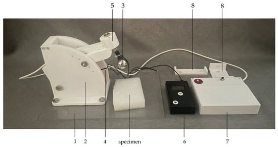 Main components of the “Surface Tester of Food Resilience” (STFR). 1 = baseplate; 2 = rig with a height-adjustable electromagnet; 3 = sphere containing two accelerometers; 4 = carbon-fiber rod connecting the sphere to a swivel; 5 = magnetic holding device attached to the sphere; 6 = digital data acquisition system; 7 = trigger for the electromagnetic holder and power supply; 8 = gauges (25 mm, 50 mm, 75 mm) to check the distance between specimen surface and sphere.