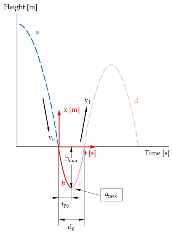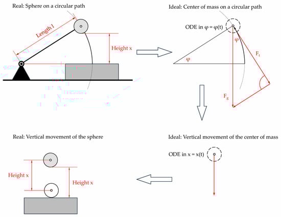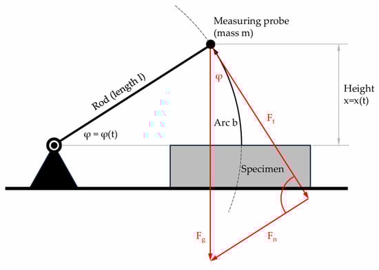 To extend the range (i.e., falling height) of the sphere, a mathematical–physical model was needed, which considers both the circular path of the sphere and a free fall model (vertical travel only). In addition, the specimen was modeled as a viscoelastic solid. Frictional forces occurring in the swivel joint were not considered. The mathematical description was achieved using a differential equation. A similar approach has been followed in a recently published paper on fluid dynamics in tubes [].
