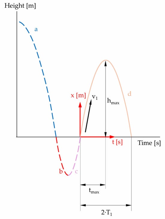 The movement of the center of mass in the air is described by the following, Equation (1), with parameters as explained in Figure 8.
