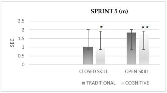 The difference in the 5-m sprint (Figure 1) after the cognitive warm-up was significantly greater than after the traditional warm-up in both the closed-skill and open-skill conditions (M = 1.03 ± 0.028 vs. M = 1.022 ± 0.025, M = 1.845 ± 0.119 vs. M = 1.761 ± 0.094, respectively).