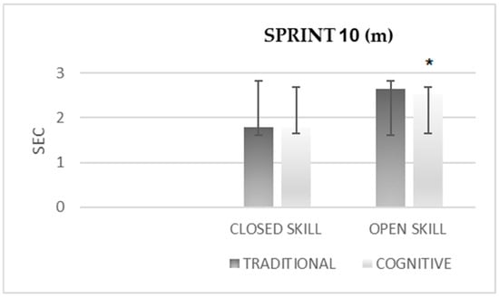 The difference in the 10-m sprint (Figure 2) after cognitive warm-up was significantly greater than after the traditional warm-up in the open-skill condition (M = 2.535 ± 0.126 vs. M = 2.656 ± 0.129). In closed skills, no significant differences were observed after the cognitive warm-up compared to the traditional warm-up.