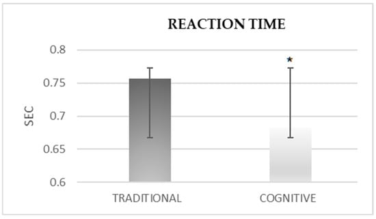 The difference in reaction time (Figure 3) after the cognitive warm-up was significantly greater than after the traditional warm-up in the open-skill condition (M = 0.683 ± 0.082 vs. M = 0.757 ± 0.1).