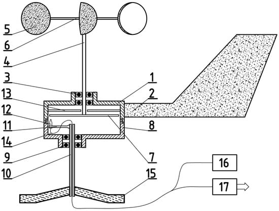 The concept of an anemometer with fibre-optic transmission of the measurement signal: 1—upper housing; 2—rudder; 3—turbine bearing; 4—turbine axis; 5—turbine cups; 6—supports; 7—impulse disc; 8—lower housing; 9—housing bearing; 10—housing axis; 11—bracket; 12—optical-fibre tip; 13—auxiliary disc; 14—optical fibre; 15—base; 16—light source; 17—light pulse detector and electronic system.