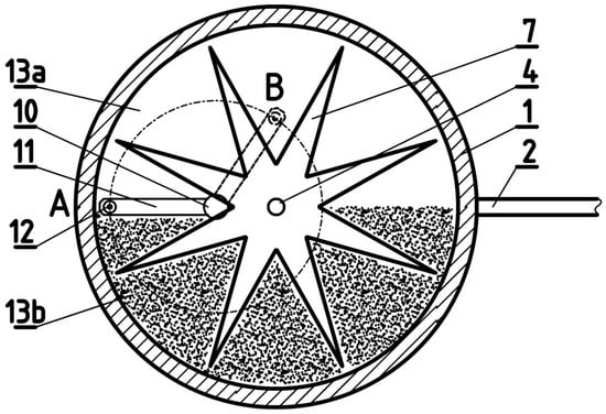 where the angle γ is half of the angle with the vertex at point O and arms passing through the intersection points of the edge of the impulse disc arm with a circle of radius r, as shown in Figure 3. By determining angle γ based on trigonometric relations and substituting it into Equation (2), after transformations, we obtain the dependence of the duty cycle η on the distance r in the form