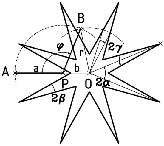 In Figure 3, the impulse disc has the shape of a star with triangular arms and rotational symmetry with an angle of 2α relative to the axis of rotation at point O. The radius of the disc is l, and the angle at the tip of the disc arm is 2β. The optical fibre support of length a is attached at point P to the axis of rotation of the anemometer housing. The distance of this axis from the axis of rotation of the impulse disc is b. The optical fibre tip is placed at the other end of the support, at point A. The fixed optical fibre support determines the direction of straight line AP, with respect to which the wind direction is measured. Rotation of the anemometer housing by an angle φ, related to the effect of the wind on the rudder, causes a relative displacement of the optical fibre tip relative to the centre of the impulse disc from point A to point B. The distance r of the optical fibre tip from the centre of the impulse disc is a nonlinear function of angle φ. According to Figure 3, the functional relationship can be determined from the geometric analysis: