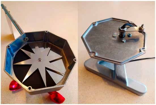 The anemometer measuring transducer was placed in an octagonal, aluminum housing 1590STPC from Hammond, ON, Canada. The rudder was attached to the housing on an aluminum boom. The upper part of the housing contained the turbine rotation axis socket with two ball bearings. The anemometer turbine with three cups was attached to the axis. The lower part of the housing contained the housing rotation axis socket with two ball bearings. The housing rotation axis was attached to the anemometer base. The interior of the anemometer housing with the measuring transducer is shown in Figure 5.