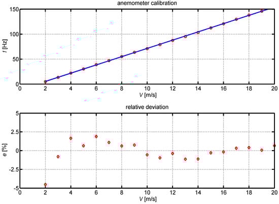 The upper graph in Figure 6 shows the measurement points of the prototype calibration in the wind tunnel in the velocity range from 2 to 20 m/s. For the given velocities V, increased by 1 m/s, the averaged frequency of pulses from the impulse disc was recorded. The movement of the anemometer turbine started from a velocity of about 1.2 m/s, and stable measurements were possible from a velocity of 1.8 m/s. A straight line was fitted to the obtained measurement points using least squares method. The parameters of the straight line are the slope ar = 8.27 Hz/(m/s) and the shift br = −11.2 Hz, respectively. The lower graph shows the relative deviation in the measuring points from the straight line. In the low velocity range, the influence of the turbine bearing resistance on the deviation from linearity is visible.