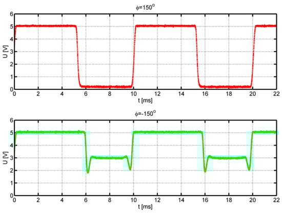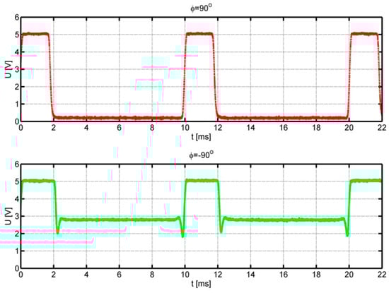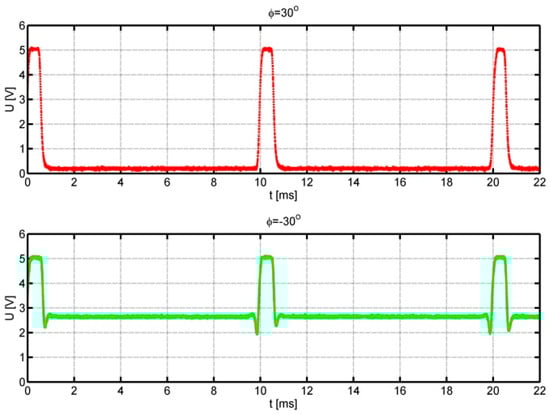 The flow velocity was selected to obtain a pulse frequency of 100 Hz. Positive angles correspond to the movement of the optical fibre tip over the black area of the auxiliary disc. Negative angles, on the other hand, refer to the mirror part of the auxiliary disc. In this case, the increased level of the signal reflected from the auxiliary disc and short spike pulses generated when the optical fibre tip passes over the edge of the impulse disc are visible. The following figures, Figure 8 and Figure 9, show analogous waveforms for setting angles φ = ±90° and φ = ±150°.