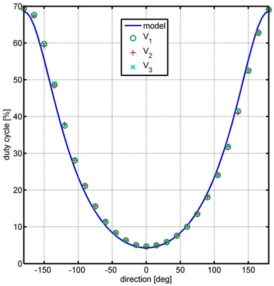 Then, the dependence of the signal duty cycle on the flow direction was measured in the full range of angles. The measurement results were recorded for angle changes every 15°, and the tests were carried out for three different flow velocities V1 = 5 m/s, V2 = 10 m/s, and V3 = 20 m/s. The measurement results are shown in Figure 10. This figure also shows the theoretical course of the dependence of the signal duty cycle on the flow direction, obtained on the basis of model (1), (3), and anemometer parameters according to Table 1.