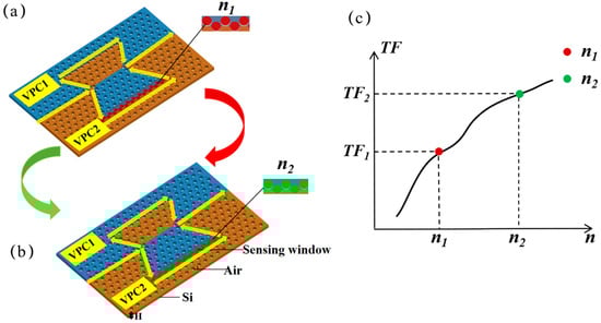 The concept of the VPC MZI refractive index sensor is shown in Figure 1, where the VPC structures are composed of holes (r = 80 nm) embedded in a silicon substrate with a lattice constant of a = 440 nm and the MZI structure consists of two straight and two Ω-shaped topological waveguides. Media with different refractive indices (n1 and n2) are injected in the sensing window (Figure 1a,b). When the refractive index increases from n1 to n2, the overall transmittance of the MZI changes continuously in the range of TF1 to TF2 at the working wavelength λ, as shown in Figure 1c. In this way, the refractive index of the medium can be measured according to the transmittance at λ.