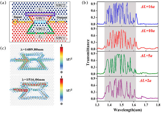 (a) A schematic diagram of the VPC MZI structure (ΔL = 5a). (b) The interference spectra corresponding to the MZI structure with ΔL = 2a, 5a, 10a, and 16a, where the gray shading region represents the working bandwidth. (c) The electric field intensity distributions in the MZI at 1489.80 nm and 1516.09 nm when ΔL is 5a.