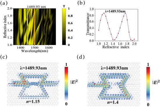 We studied a substance with a refractive index range of 1.0–2.0 and with the sensing window filled with an index step of 0.05. Here, the contour map of the intensity distributions versus the wavelength and the refractive index of an MZI structure of L1 = 18a and L2 = 23a is shown in Figure 3a, which shows distinct changes in the refractive index variation. Then, we studied the refractive index-induced intensity modulation at a single wavelength (λ = 1489.93 nm, marked by the red dashed line in Figure 3a), which is shown in Figure 3b. There is a semi-periodic change (similar to a sine curve) from peak to valley in the transmittance with an increased refractive index. Constructive interference happens when the refractive index is 1.15, resulting in a high forward transmittance of 0.87, and the electric field distribution is shown in Figure 3c. In comparison, destructive interference occurs when the refractive index is 1.40, resulting in a low transmittance of 0.04, and the electric field intensity distribution is shown in Figure 3d. The sensitivity defined by the change in transmittance (ΔT) divided by the change in the refractive index (Δn), as ∆T⁄∆n, is 332%/RIU, where RIU is the refractive index unit (RIU), and the modulation depth reaches 83%.