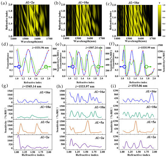 We further studied the path length difference ΔL based on the performance of refractive index sensing, in which a length difference of ΔL = 2a, 10a, and 16a was chosen in addition to the ΔL = 5a design. The resulting contour maps of the transmittance versus the refractive index and wavelength are shown in Figure 4a–c. One can see that the number of peaks and valleys increases with the increase in the path length difference ΔL, which is expected from the equation , and the wavelengths of the peaks and valleys meet the conditions of (peak) and (valley), respectively, where m is an integer. Then, we studied the effect of refractive index change on the transmittance of a particular wavelength. Due to the different interference spectra, we chose different wavelengths for each length difference. Through analysis and verification, we chose 1531.96 nm (ΔL = 2a), 1507.24 nm (ΔL = 10a), and 1535.99 nm (ΔL = 16a), as shown in Figure 4d–f, which shows periodical patterns with distinct peaks and valleys. With the increase in the arm length difference, the number of peaks and valleys increases, resulting in a change in sensitivity. The sensitivity changes continuously with the increase in the refractive index, and the sensitivity tends to increase with the increase in the arm length difference.