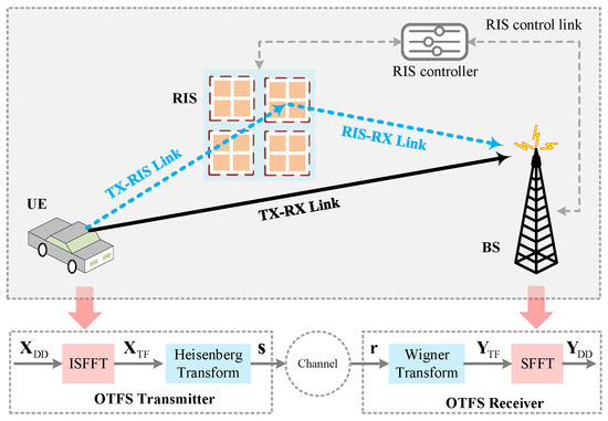 Reconfigurable intelligent surfaces (RISs) have emerged as a highly promising solution to mitigate physical blockages by intelligently controlling the wireless propagation environment [11,12,13]. Therefore, a combination of RIS and OTFS offers comprehensive advantages, including flexible channel configuration and reliable communication in high-mobility scenarios. Recent works highlight the effectiveness of deploying RIS in OTFS systems to enhance overall system performance. In [14], it is demonstrated that RIS-assisted OTFS systems outperform RIS-assisted OFDM systems, exhibiting excellent performance over a wide range of channel parameters. An efficient and reliable transmission scheme is proposed in [15], which leverages the information in the Doppler-delay (DD) domain to facilitate the configuration of RIS. In [16], efficient CE and symbol detection (SD) performance is achieved for hybrid RIS-assisted millimeter wave OTFS systems by combining the expectation maximization with the message passing (MP) algorithms.