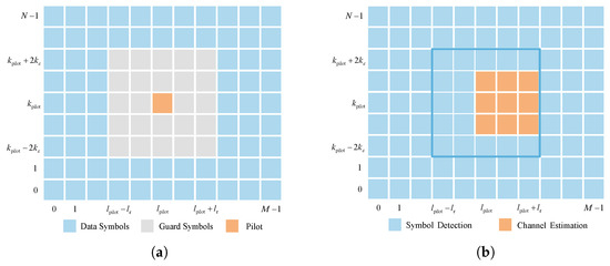 where , , , and denote the pilot symbol, the -th data symbol, the normalized maximum delay, and the normalized maximum Doppler shift, respectively. and , where and are the maximum delay and Doppler shift, respectively. and can be determined based on prior channel statistics or through system-adaptive calibration [39,40]. In Equation (15), guard zeros are deployed. Accordingly, the overhead for pilot and guard symbols is calculated as . This overhead is small for typical channel models [5], since the delay and Doppler spreads are relatively limited compared to the size of the OTFS frame.