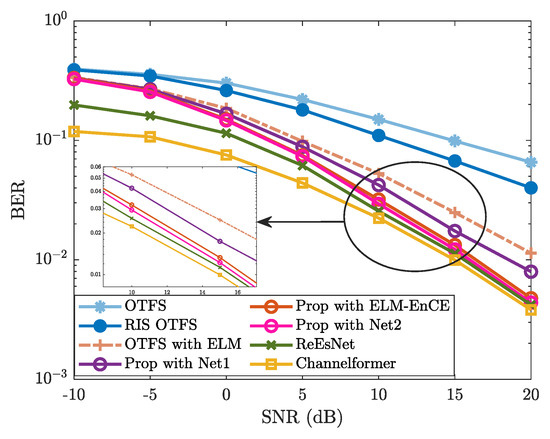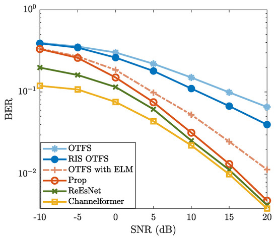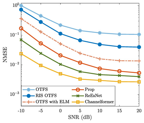 To validate the effectiveness of the proposed method, Figure 3 and Figure 4 show the BER and NMSE performance. From Figure 3, the NMSE of “Prop” is consistently lower than those of “OTFS”, “RIS OTFS”, and “OTFS with ELM” for each specific SNR. This indicates that “Prop” is effective in improving the CE accuracy of “OTFS”, “RIS OTFS”, and “OTFS with ELM”, thereby enhancing their NMSE performance. Notably, the NMSE of “Prop” is lower than that of “RIS OTFS” for each given SNR. Similarly, the NMSE of “OTFS with ELM” is also lower than that of “OTFS” for simulated SNR regions. These results validate the effectiveness of introducing the ELM network. In other words, methods incorporating the ELM network demonstrate improved NMSE performance compared to those without ELM. Figure 3 also demonstrates that the NMSE performance of “Prop” is slightly inferior to that of the DL-based methods “ReEsNet” and “Channelformer”. However, both “ReEsNet” and “Channelformer” require intricate parameter tuning and prolonged training time, which are not necessary for the proposed method. More importantly, the NMSE curves of “ReEsNet” and “Channelformer” exhibit a performance floor in high-SNR regions (e.g., ≥10 dB), indicating limited performance gains. Therefore, with a much simpler implementation, the proposed method achieves acceptable NMSE performance and holds significant potential compared to DL-based CE methods.