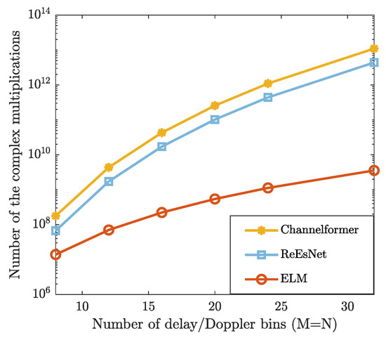 In Figure 6, we compare the complexity of the proposed method with that of DL-based methods (e.g., “ReEsNet” and “Channelformer”) in terms of the number of complex multiplications. It can be observed that the proposed ELM method consistently requires fewer complex multiplications than both “ReEsNet” and “Channelformer” for each given frame size. Considering the comparisons in NMSE and BER performance, the proposed ELM network achieves a better trade-off between the complexity and the estimation accuracy. Additionally, the average running time of each method is provided in Table 2. From Table 2, the proposed ELM method has significantly shorter running time compared to other comparison methods, demonstrating its superiority.