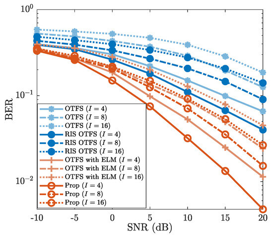 In Figure 7, we illustrate the robustness of the proposed method against the impact of the modulation order I, where , and are considered. From Figure 7, it is evident that BERs increase as the modulation order I increases. For example, when SNR is , the “Prop” employing 4-QAM (i.e., ) exhibits a BER of , while the BERs of 8-QAM () and 16-QAM () are about and close to , respectively. Furthermore, Figure 7 illustrates that the “Prop” achieves a lower BER than those of “OTFS”, “RIS OTFS”, and “OTFS with ELM” for each modulation order I. For the case where (4-QAM) and SNR is , the BER of “Prop” is about , whereas the BERs of “OTFS”, “RIS OTFS”, and “OTFS with ELM” all exceed . Despite the variation of modulation order I, the BER performance of the proposed method consistently outperforms those of “OTFS”, “RIS OTFS”, and “OTFS with ELM”. Therefore, the proposed method possesses a good robustness against the impact of the modulation order I.