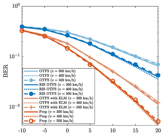 Figure 8 presents the robustness of the proposed method against varying UE speeds (i.e., v = 300 km/h, v = 400 km/h and v = 500 km/h). The “Prop” exhibits highly similar BER performance under different UE speeds. For example, when SNR is , the BERs of “Prop” for different v are all approximately . This confirms the BER performance reliability of the proposed method in high-mobility scenarios. Additionally, from Figure 8, it is evident that “Prop” achieves a lower BER than those of “OTFS”, “RIS OTFS”, and “OTFS with ELM”. For the case where SNR is , the BER of “Prop” is about , while the BERs of “OTFS”, “RIS OTFS”, and “OTFS with ELM” are all higher than . This illustrates that the BER performance of “Prop” outperforms those of “OTFS”, “RIS OTFS”, and “OTFS with ELM” for different UE speeds. On the whole, the proposed method improves the BER performance of “OTFS”, “RIS OTFS”, and “OTFS with ELM”, even against the variations of the UE speed v.