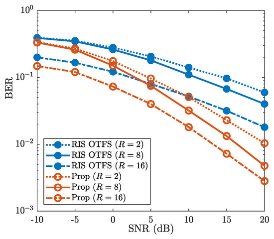 Figure 9 demonstrates the robustness of the proposed method for different numbers of sub-surfaces, where , and are considered. It can be observed that the BERs decrease as the number of sub-surfaces R increases. For example, when SNR is , the BERs of “Prop” are , and for , and , respectively. This validates the benefits of increased RIS sub-surfaces on BER performance improvement. Additionally, Figure 9 shows that the “Prop” achieves lower BER than that of “RIS OTFS” for each given value of R. When and SNR is , the BER of “Prop” is about , while the BER of “RIS OTFS” reaches about . For the number of different sub-surfaces R, the “Prop” consistently provides better BER performance than that of “RIS OTFS”. Therefore, against the varying number of sub-surfaces R, the proposed method achieves superior BER performance compared to “RIS OTFS”.