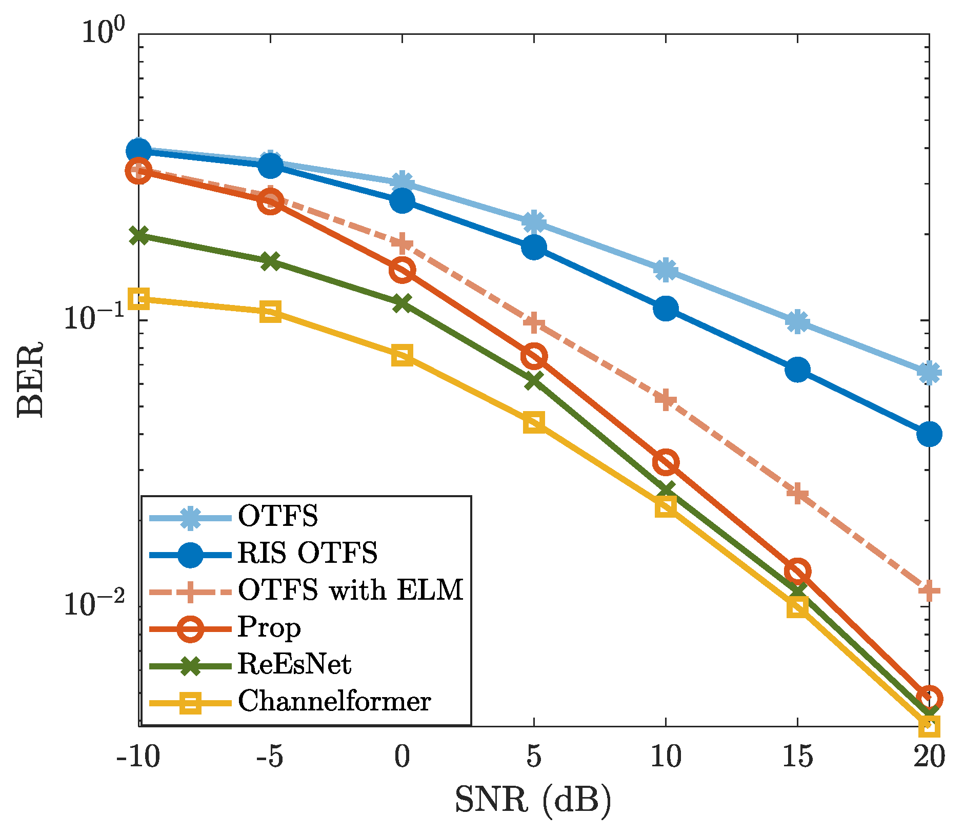 In Figure 4, the BER performance of “Prop” exhibits a similar trend as observed in Figure 3. The proposed method achieves significantly lower BER compared to “OTFS”, “RIS OTFS”, and “OTFS with ELM”, while remaining slightly inferior to the DL-based “ReEsNet” and “Channelformer”, particularly in the high-SNR region (e.g., ≥10 dB). The BER performance of “OTFS”, “RIS OTFS”, and “OTFS with ELM” is improved due to enhanced CE accuracy by leveraging the ELM network. Although the proposed method does not outperform “ReEsNet” and “Channelformer”, it demonstrates comparable performance at high SNRs. Moreover, it offers notable advantages in terms of training simplicity and computational efficiency. On the whole, both Figure 3 and Figure 4 validate the effectiveness of the proposed method and highlight the great potential of ELM-based CE.