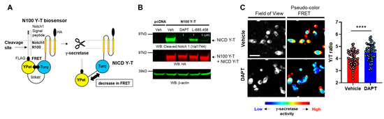 The plasmid encoding the Notch1 N100 Y-T biosensor was developed in a previous study [15]. An anti-APP C-terminus antibody was purchased from BioLegend (San Diego, CA, USA), anti-β-actin was from MilliporeSigma (Burlington, MA, USA), anti-cleaved Notch1 (Val1744) and anti-GAPDH antibodies were from Cell Signaling Technology, Inc (Dover, MA, USA), and anti-HA antibody was from Abcam (Cambridge, UK). γ-Secretase inhibitors DAPT and L-685,458 were purchased from Abcam and DMSO was from MilliporeSigma. pHrodo™ Red Escherichia coli (E. coli) BioParticles™, pHrodo™ Green Zymosan BioParticles™, and LysoTracker™ Deep Red were from Thermo Fisher Scientific (Waltham, MA, USA).