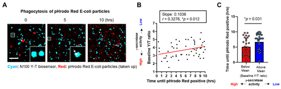 We next incubated BV-2 cells expressing the N100 Y-T biosensor with pHrodo™ Red E. coli BioParticles™ to perform multiplexed live-cell imaging analysis. These particles are pH-sensitive and thus non-fluorescent outside the cell but fluorescent bright red in phagosomes. In the imaging, we first conducted spectral FRET analysis to measure γ-secretase activity at the baseline on a cell-by-cell basis using the N100 Y-T biosensor, as described above. Then, we employed time-lapse live-cell imaging to track how long it took for individual cells to become positive for pHrodo™ Red E. coli BioParticles™ (Figure 2A). We discovered a statistically significant correlation between γ-secretase activity and the time to become E. coli BioParticles™-positive. Notably, cells exhibiting lower γ-secretase activity took longer to become E. coli BioParticles™-positive compared to those with higher activity (Figure 2B). We also divided the cells into two groups based on whether they were below or above the average mean of the Y/T FRET ratio at the baseline (t = 0), representing cell groups with higher or lower γ-secretase activity, respectively. We found that the cells with lower endogenous γ-secretase activity took a significantly longer time to become E. coli BioParticles™-positive compared to those with higher activity (Figure 2C).