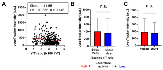 Not distinct lysosomal pH between the BV-2 cells with lower vs. higher γ-secretase activity: (A) BV-2 cells expressing the N100 Y-T biosensor were incubated with LysoTrackerTM DeepRed. γ-Secretase activity at the baseline was calculated and LysoTrackerTM DeepRed fluorescence was measured on a cell-by-cell basis, showing that there is no significant correlation. N = 289 cells. p = 0.146. Pearson correlation coefficient. (B) No significant difference in LysoTrackerTM DeepRed intensity between the BV-2 cells with lower γ-secretase (i.e., Y/T ratio is higher than the average mean) and those with higher activity (p = 0.07). N = 130–159 cells, Mann–Whitney U test. n.s. means not significant. (C) LysoTrackerTM DeepRed intensity is not significantly different between BV-2 cells treated with DAPT (1 µM) or vehicle control for 16 hrs (p = 0.91). N = 143–289 cells, Mann–Whitney U test. n.s.: not significant.