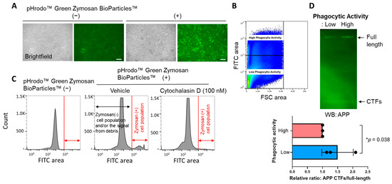 Lastly, to verify the result from the time-lapse multiplexed imaging that utilizes E. coli BioParticles™, BV-2 cells were first incubated with pHrodo™ Green Zymosan BioParticles™ for 16 hrs (Figure 4A), and then the cells were subjected to FACS to be sorted out based on the Zymosan fluorescence (Figure 4B). The numbers of Zymosan-positive cells decreased by the treatment of cytochalasin D, a potent phagocytosis inhibitor [17,18], evidencing that the fluorescence is dependent on the phagocytosis of Zymosan BioParticles™ (Figure 4C). Then, the sorted cells with distinct phagocytic activities were subjected to Western blot using an APP C-terminus antibody to assess γ-secretase activity. Strikingly, we found that APP C-terminal fragments, immediate endogenous substrates of γ-secretase, over the APP full-length ratio are significantly increased in the cells with lower phagocytic activity compared to those with higher phagocytic activity (Figure 4D). This suggests that BV-2 cells with reduced phagocytic activity exhibit lower endogenous γ-secretase activity and further supports the link between γ-secretase and microglial phagocytosis.