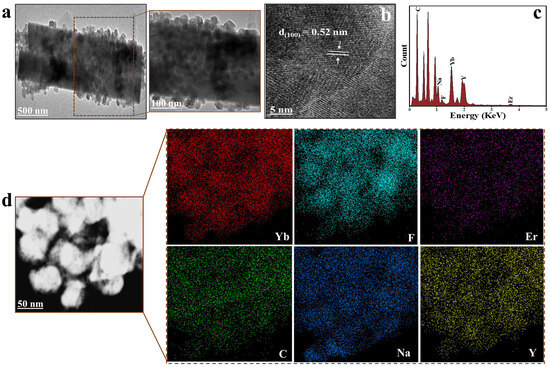 Structure and morphology of PS@LUC-micro. (a) TEM image. (b) d-spacing of PS@LUC-micro. (c) EDX elemental graph. (d) TEM EDX elemental mapping.