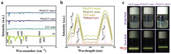 Structural and optical characterization of PS@LUC-micro and PS@LUC-nano. (a) FTIR spectra. (b) The luminescent upconversion emission spectra of samples. (c) Digital photos of PS@LUC-nano and PS@LUC-micro captured in bright field and dark field under 980 nm laser excitation.