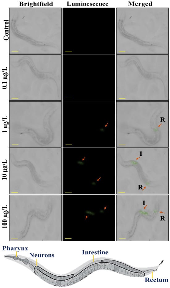 The conventional techniques suffer from limited sensitivity for nanoplastics due to weak light scattering [29], the presented upconverted luminescence probes overcome this fundamental limitation through near-infrared-to-visible (NIR-vis) photon upconversion. This innovative approach provides three key advantages of complete elimination of autofluorescence interference through anti-Stokes emission and visualization at environmentally relevant concentrations (0.1–100 μg/L). The synthesized luminous PS@LUC-nano and PS@LUC-micro nanoparticles were utilized to enhance their detectability by effectively eliminating autofluorescence from the cells of C. elegans when excited by a 980 nm NIR laser source. This approach enabled the capture of highly specific images with minimal background noise, ensuring clearer visualization of the nanoparticles [39,45,46]. The 980 nm NIR excitation emits low-energy photons, which are converted into high-energy visible light emissions, significantly reducing the interference from background fluorescence in the organism’s body cells. To confirm that the observed luminescence was solely due to the PS@LUC nanoparticles, a blank control (C. elegans with no particles) was included in all experiments. This control was subjected to the same 980 nm irradiation to ensure no luminescence arose from C. elegans or the irradiation itself. As depicted in Figure 3, no luminescence from PS@LUC-micro was observed in worms at doses of 0 μg/L and 0.1 μg/L. A faint green signal appeared at a dose of 1 μg/L. In contrast, at higher doses of 10 μg/L and 100 μg/L, the nanoparticles emitted significantly more intense luminescence, particularly in the posterior regions of the worm intestine. This suggests that the microparticles are accumulating in the intestinal lumen, where digestion and absorption processes take place [16,44,47].