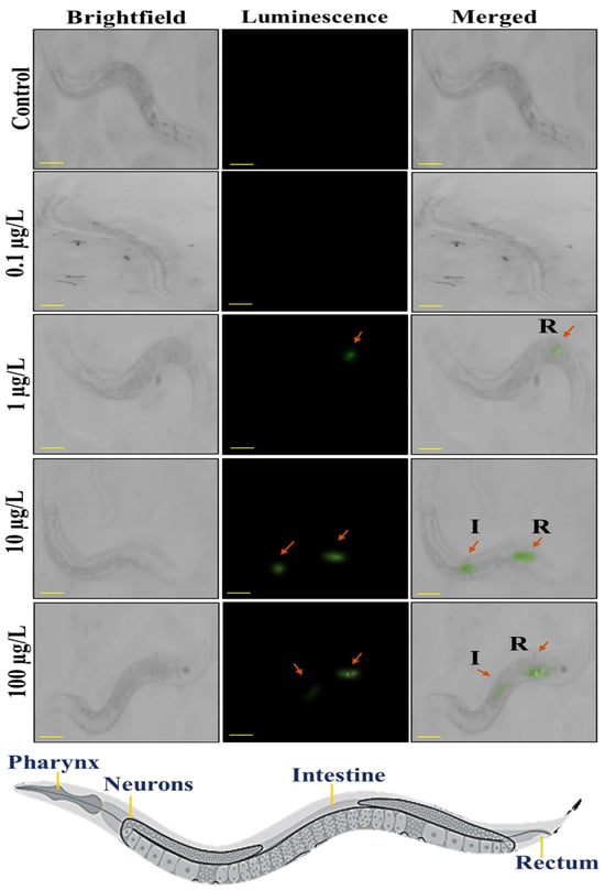 PS@LUC-nano at doses of 10 μg/L and 100 μg/L shows more intense luminescence in the pharynx, intestine region and tail region of the worms. Luminous signals from Figure 3 and Figure 4 show that the gastrointestinal tract of C. elegans has great permeability to nanoparticles compared to microparticles, hence enhancing their absorption. Moreover, nanoparticles may engage with the intestinal microvilli or enterocyte cells of the digestive epithelium, facilitating their internalization [48]. Upon ingestion, nanoparticles may permeate the intestinal walls and then enter the hemolymph, circulating throughout the organism [16,47]. The posterior area may exhibit reduced fluorescence relative to the intestines. The detection of luminescence in the front and posterior regions may suggest that the particles are circulating inside the body, maybe migrating from the digestive system to other areas of worm. The posterior area may exhibit reduced fluorescence relative to the intestines [47,49].