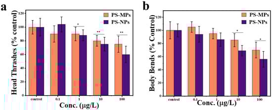Physiological effects on locomotion behavior of worms following exposure to PS-MPs and PS-NPs at varying concentrations. (a) Effect of PS-MPs and PS-NPs on head thrashes (% control) of C. elegans after exposure. (b) Effect of PS-MPs and PS-NPs on body bends (% control) of C. elegans after exposure. The bars represent mean ± standard error of the mean (SEM), n = 30 per group. * p < 0.05 and ** p < 0.01 indicate significant differences between PS-MPs and PS-NPs.