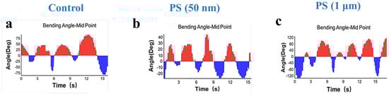 Figure 6 depicts the effect of PS-NPs and PS-MPs on the locomotion of C. elegans by examining the bending angle-midpoint with time. The bending angle analysis revealed distinct locomotor patterns across groups. The control group (Figure 6a) demonstrates a stable oscillation pattern with a uniform range of motion. It indicates normal neuromuscular activity with a consistent bending amplitude of 45° ± 3° and low Erratic Movement Index (EMI) values (0.2 ± 0.1), reflecting coordinated neuromuscular activity. In contrast, worms exposed to PS-NPs (Figure 6b) exhibit a significant decrease in bending angles, characterized by diminished amplitude (25° ± 5°) and erratic movement patterns alongside elevated EMI (0.7 ± 0.2), characterized by irregular pauses (“freezing”) and disrupted body waves, suggesting impaired neural signals. It indicates compromised neuromuscular coordination, presumably attributable to the capacity of nanoplastics to infiltrate tissues and alter neuronal communication [53]. PS-MPs (Figure 6c) exposure leads to a milder decline in bending angles with amplitudes of 35° ± 4° and mildly elevated EMI (0.3 ± 0.1), suggesting that microplastics largely induce mechanical interference rather than direct neural damage [52,54]. The size-dependent effects revealed underscore the enhanced bioavailability and cellular contact of nanoplastics, rendering them more perilous than microplastics. Although PS-MPs are mostly restricted to the gastrointestinal tract, PS-NPs may permeate biological tissues, resulting in oxidative stress, mitochondrial malfunction, and increased locomotor impairment [55]. These results underscore the increased ecological hazards associated with nanoplastics, since their diminutive size facilitates profound biological interactions and systemic toxicity, prompting worries over their persistent impacts on species and ecosystems [16,52].