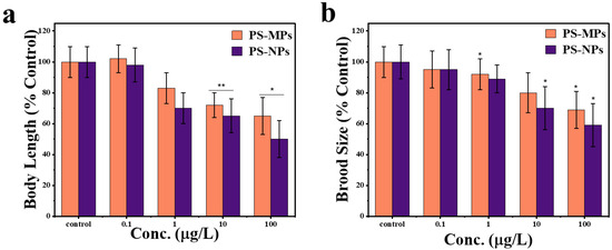 Physiological effects on growth of worms following exposure to PS-MPs and PS-NPs at varying concentrations. (a) Effect of PS-MPs and PS-NPs on body length (% control) of C. elegans after exposure. (b) Effect of PS-MPs and PS-NPs on brood size (% control) of C. elegans after exposure. The bars represent mean ± standard error of the mean (SEM), n = 30 per group. * p < 0.05 and ** p < 0.01 indicate significant differences between PS-MPs and PS-NPs.
