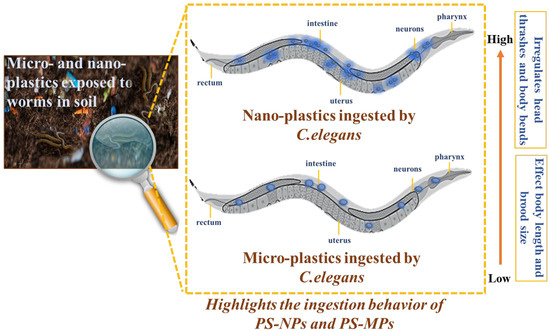- Hu, J.; Li, X.; Lei, L.; Cao, C.; Wang, D.; He, D. The toxicity of (nano) microplastics on C. elegans and its mechanisms. In Microplastics in Terrestrial Environments: Emerging Contaminants and Major Challenge; Springer: Cham, Switzerland, 2020; pp. 259–278. [Google Scholar]