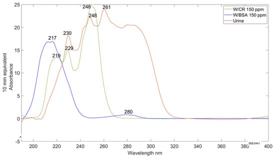 Figure 1 presents the UV/Visible absorption spectra of bovine serum albumin (BSA) and creatinine in water at a concentration of 150 mg/L and a spectrum of unspiked urine. The spectrum for BSA features a prominent peak at 217 nm, which corresponds to the peptide (amide) chromophore of the protein, primarily associated with the side chains of tryptophan (W) and phenylalanine (F). Additionally, a peak at 280 nm arises from the combined contributions of the main light-absorbing amino acids: tryptophan (W), tyrosine (Y), and phenylalanine (F). Although other light-absorbing amino acids are present in proteins, their absorption intensities in this spectral range are less pronounced compared to W, Y, and F [