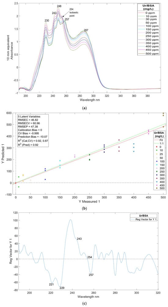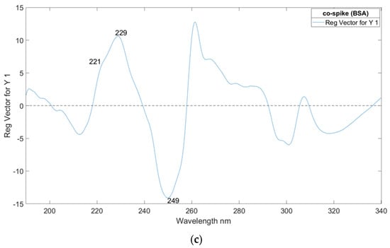 Figure 2c illustrates the absorption bands responsible for the calibration. A subtle positive band at 243 nm correlates with higher BSA concentrations, while negative bands at 221 nm, 229 nm, and 257 nm are associated with lower BSA concentrations in urine spiked fractions. The band at 254 nm, which lies between the positive and negative axes, contributes to the calibration plot. Its position at the isosbestic point, where a conformational transition of the protein occurs, underscores its significance in the regression vector.