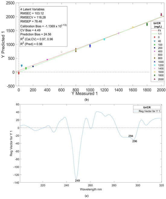 Figure 3c displays the regression vector plot, illustrating the impact of individual predictor variables on the response variable. Negative peaks in this plot correspond to bands associated with lower creatinine concentrations. The peak at 249 nm in the regression vector aligns closely with the 248 nm band observed for creatinine in water. The 1 nm difference can be attributed to interactions between creatinine and other components in the complex urine matrix.