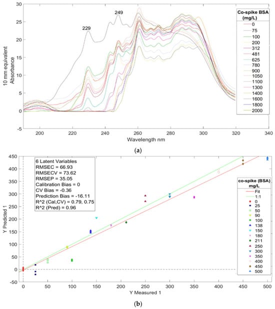2 values of 0.92 for calibration, 0.87 for cross-validation, and 0.92 for prediction (PRED(CV)). These values demonstrate a strong correlation between the spectra and BSA concentration, highlighting the model’s effectiveness in explaining data variability. The Limit of Detection (LOD) for BSA using this method was calculated to be 28.23 mg/L.