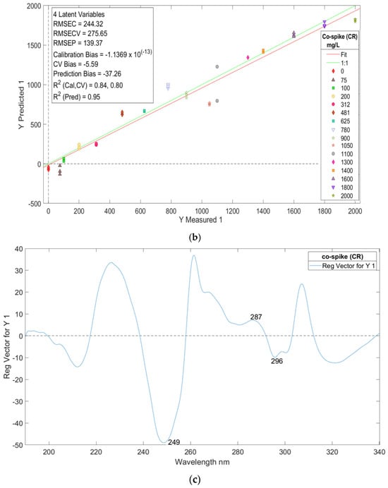 Figure 5b), the RMSEC and RMSECV values are 244.32 mg/L and 275.65 mg/L, respectively. The prediction models for both BSA and CR demonstrate robust performance, with R