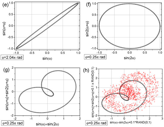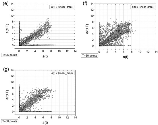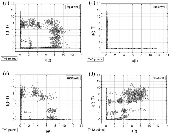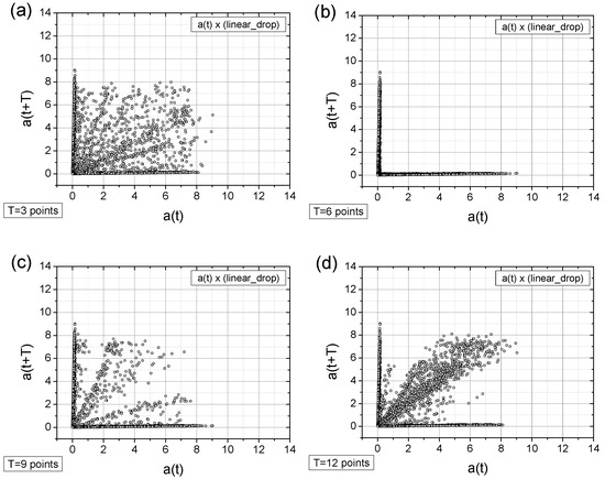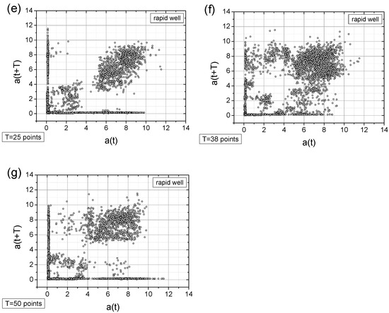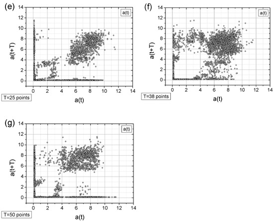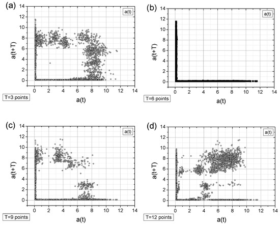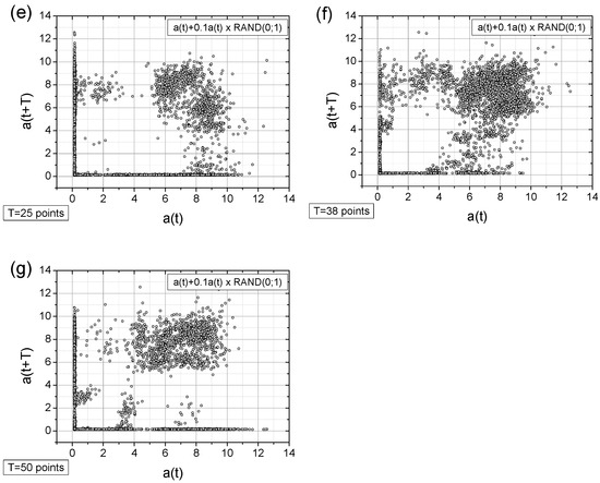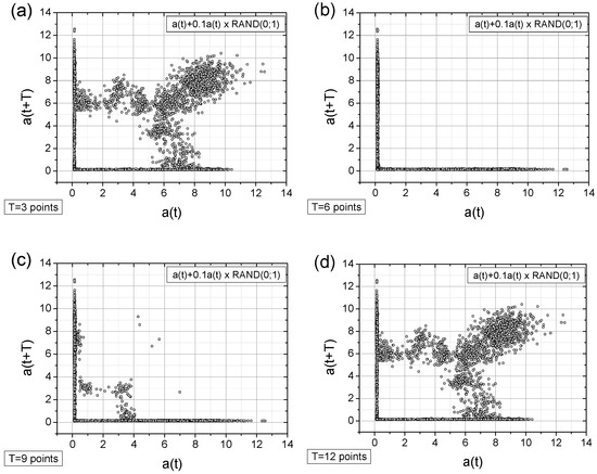 - Adding a random factor to the signal disrupts its periodicity: On a map with a time shift of T = 9 points (cf. Figure 11a,c), the map completely changes its character.
