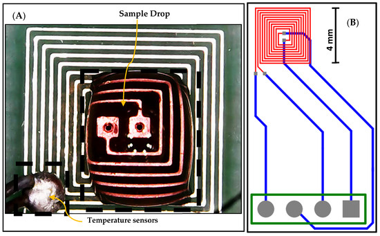 (A) The fabricated chip and external temperature sensor, and (B) the layout of the fabricated DFM chip based on PCB technology.