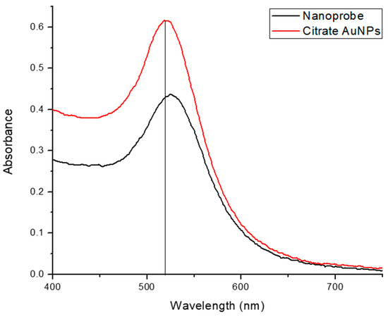 The functionalization procedure was precisely described by Hill and Mirkin [36]; however, modifications were made to optimize the surface coverage while maintaining nanoparticle stability. This nanoprobe was also characterized using UV-Vis, and the two reagents’ spectra were superimposed, as shown in Figure 5. The functionalization of citrate AuNPs is obvious due to the shift in the spectrum of the nanoprobe toward the longer wavelength, which implies a larger size.