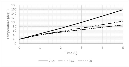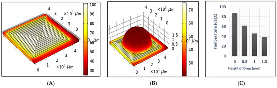 Figure 6A,B illustrate the temperature distribution across the DFM resulting from the application of a 2-ampere current for one second, under dry and sample test conditions, respectively. Unfortunately, the sample affected the generated temperature, as it decreased significantly from 94.5 to 41.5 after one second, as shown in Figure 6. Therefore, the power should be readjusted to reach the desired temperature when heating a sample. Also, Figure 6B,C show that the temperature across the drop sample decreases significantly as it approaches the top. Figure 7 shows the generated temperatures versus time at the center point of the DFM under three different conditions (dry, sample, and cooling tests). The performance of the DFM is significantly affected in the case of the sample test. The generated heat in the presence of a sample is much lower than in the absence of a sample. Therefore, having a sensor to measure the sample temperature and reset the power that is applied to the DFM is important. The cooling test shows the cooling rate of the DFM after being heated using a 1 s pulse.